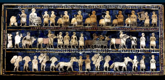 1928년 수메르의 왕실 무덤에서 출토된 유물에는 당시 모습을 타임캡슐처럼 조각해 새겨 넣었는데 중간 사람들은 물건을 팔기 위해 도시로 가는 사람들이고 아래 사람들은 밀과 보리를 농촌에서 가져온 뒤 도시의 제분소 공장으로 모아서 사람들에게 배급해주고 양털을 가지고 오면 그 털로 옷을 만들어 배급한다. 이때 꼭 주는 것이 맥주였다.