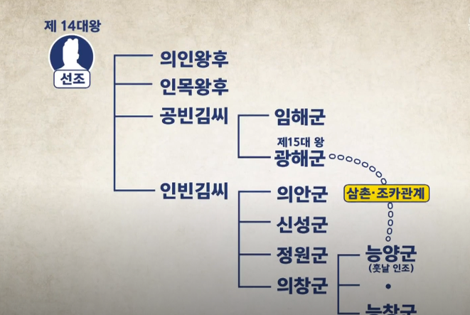 인조와 광해군의 관계는 삼촌과 조카 관계였다. 선조에게는 아들이 많았다. 그 중에 한 사람이 광해였고 인빈김씨 3째 아들 정원군의 첫째 아들이 훗날 인조이다. 광해가 세자일때 인목왕후에게 적통 영창대군이 태어나게 되고 이때문에 불안하게 된 광해였다. 광해는 적장자 콤플렉스도 있었다.