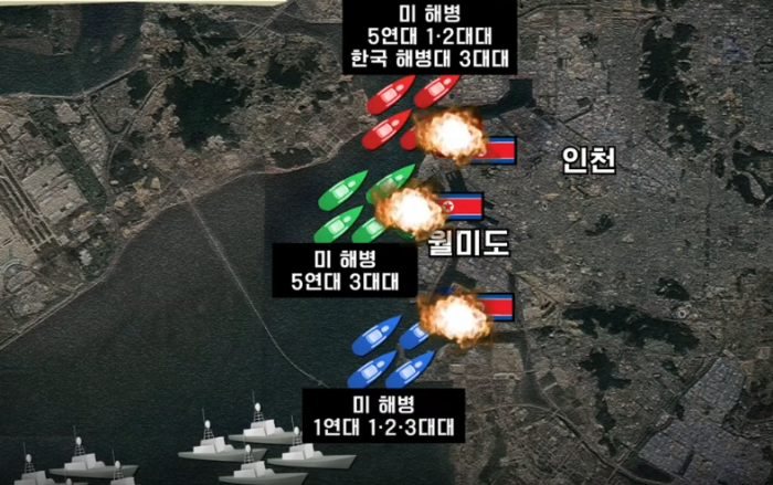 월미도 상륙작전에 가장 중요한 것은 월미도 점령한 병력이 12시간을 버티는 것이었다. 갯벌에 물이 빠졌기 때문에 그냥 해안가에 버터야 하는 것이다. 녹색 해안 월미도에서 12시간을 버티면 적색, 청색 해안이 만조로 해안 진입이 가능했다. 북한군 제압을 위해 4시간가량 대규모 포격을 가했고 말 그대로 월미도는 초토화된다. 6시 33분에 포격이 멈추고 오전 8시경에 미 제1해병사단 대원 150여명이 월미도에 상륙했다. 오전 8시경 완벽하게 월미도를 장악하게 된다.