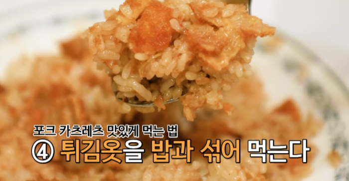 여기서 튀김옷은 바로 먹지 않고 우스터 소스가 스며들때까지 기다린 후 고기를 먼저 안주로 먹고 이후 튀김옷을 밥과 섞어 먹는다.