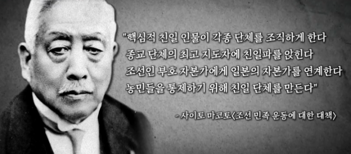 1910년 한일합병이후 일순간 나라를 잃은 삼천만 조선민중은 비탄에 잠기게 되고 1919년 3.1운동이 평화적으로 전개되지만 일본은 무자비하게 총칼로 민중을 탄압했다. 이후 일본은 문화통치로 식민정책을 바꾼다. 1920년대 이 문화통치를 통해 수많은 친일파가 양성되었다. 그 시발점을 만든 인물이 사이토 마코토 총독이었다. 그는 폭력이 아닌 교묘히 민족분열을 조장해 조선 민족을 분열시키려 했던 인물이다.