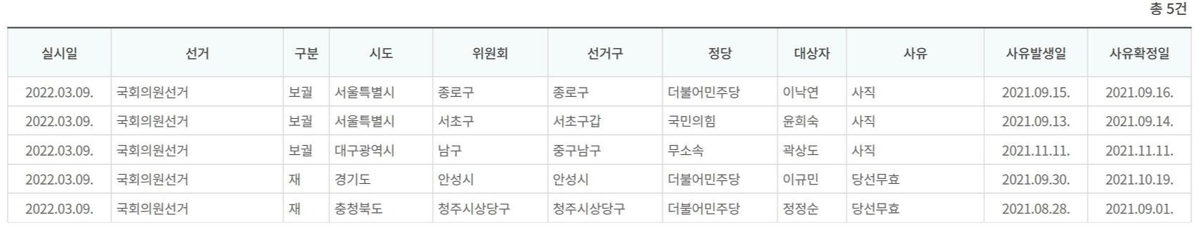 2022년 3월 9일 대통령 선거와 함께 치러질 재보궐 선거 확정 상황으로 모두 국회의원선거입니다.