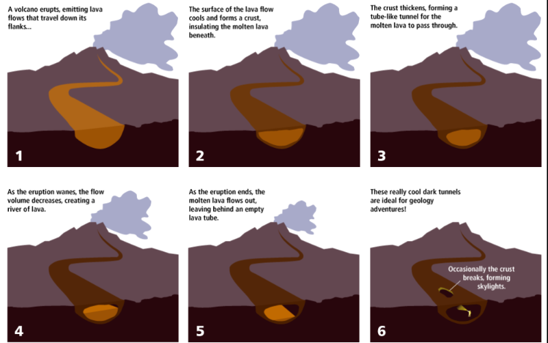 - 용암이 다 빠져나가면 **빈 터널**만 남아요 → 이게 바로 용암동굴!