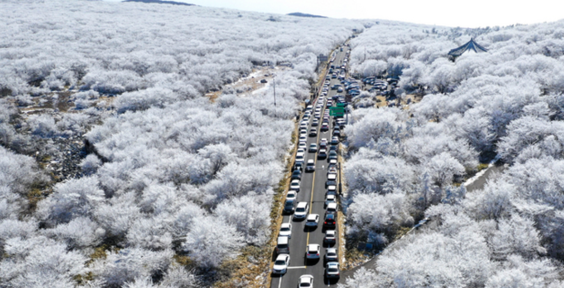 1100도로는 겨울철 제주에서 가장 인기 있는 드라이브 코스입니다. 고도가 높기 때문에 해안가에는 비가 내려도 이곳에는 눈이 내리는 경우가 많습니다. 특히 나뭇가지에 서린 눈꽃(상고대)이 장관을 이루어, 겨울만 되면 설경을 감상하려는 관광객과 도민들로 인산인해를 이룹니다.
