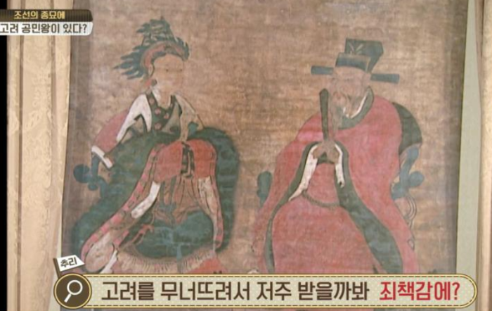 이유는 조선의 1대왕 이성계가 고려는 무너뜨리고 조선을 지었기 때문에 고려를 무너뜨려서 저주 받을까봐? 종묘지에 따르면 종묘를 지을때 갑자기 회오리 바람이 불더니 공민왕의 영정이 떨어졌다. 그래서 떨어진 자리에 공민왕 신당을 건립했다고 한다.  사진 속의 공민왕과 노국공주는 철저하게 원나라 복식을 하고 있다.