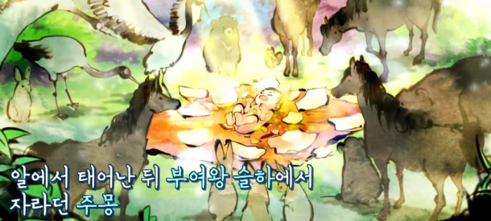 이 알을 깨고 주몽이 태어난다. 알에서 태어난 뒤 부여왕 슬하에서 자랐는데 목숨의 위협을 받아 부여를 탈출해 비류곡 졸본에 나라를 건국하게 된다.