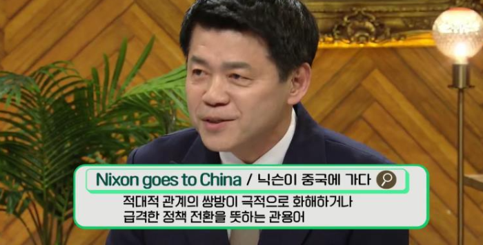 적대적 관계의 쌍방이 극적으로 화해하거나 급격한 정책 전환을 뜻하는 관용어가 있는데 미국 닉슨 대통령은 뼈 속까지 반공주의자였다. 그런 사람이 중국을 방문했던 사건은 쇼크에 가까웠고 닉슨 인 차이나라는 오페라까지 만들어졌다.