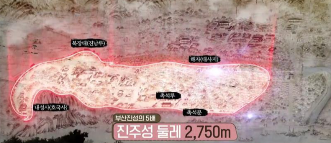 진주성은 남쪽에는 남강이 흐르고, 서쪽에는 산이 있다. 천혜의 요새이자 엄청난 크기의 진주성을 공격하기 위해 산대라는 도구를 이용해 성벽에 달라붙어 올라갔고 우리 백성들은 가마솥에 물을 끓여서 펄펄 끓는 물을 그대로 들이 부으면서 처절한 전투 속에 진주성을 지켜냈던 현장이었다. 수적인 열세를 극복하고 진주성을 지켜냈던 백성들이다.