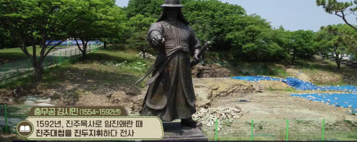 당시 워낙 왜군의 수가 많아 일반 백성들도 함께 나와 싸웠고 이때 돌팔매꾼 조씨 이야기가 인상적이다. 조 씨의 돌팔매질에 맞고 쓰러진 일본군이 백여 명에 달했다고 한다. 진주성을 지켜내겠다는 백성들의 염원을 알 수 있다. 이런 백성, 관군, 의병을 한 힘으로 모았던 이가 충무공 김시민 장군이다. 진주대첩의 김시민 장군의 시호도 충무공이었다. 조선시대 충무라는 시호를 받은 사람은 이순신, 남이, 김시민을 포함 9명이었다.
