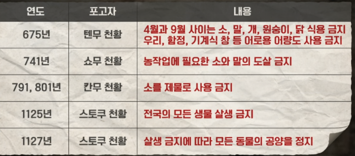 673년 일본이라는 나라 이름과 천황이라는 명칭을 만들고 일본 역사상 최초로 강력한 전제 권력을 행사했던 텐무 천황이 등장하게 된다. 텐무 천황은 국교인 불교 교리를 내세우게 된다. 불교의 핵심 가치인 살생 금지 사상을 실천을 위해 백성들에게 육식 금지령을 발표한다.