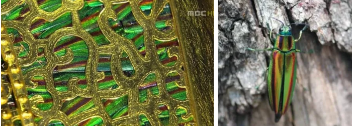 수천 장의 진짜 비단벌레 날개를 금동판 아래에 붙여 만든 신라 최고급 유물입니다.