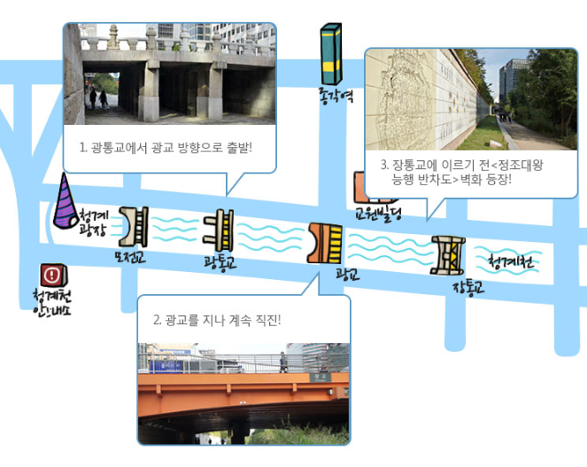 - 세계 최대 규모의 도자 벽화: 청계천 광교와 삼일교 사이에 있는 장통교를 중심으로 설치된 이 벽화는 총 길이 186m, 높이 2.4m에 달하는 도자 벽화로, 세계 최대 규모로 알려져 있다. 30cm x 30cm 크기의 백자 도판 4,960매를 하나하나 연결하여 완성한 작품이다.