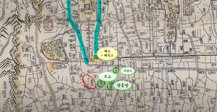 - 교통망: 도로는 한 줄 선으로, 하천은 두 줄 선으로 그려져 있으며, 중요한 하천은 푸른색으로 채색되어 있다. 이는 당시 서울에서 물길이 교통과 생활에 얼마나 중요했는지를 보여준다.