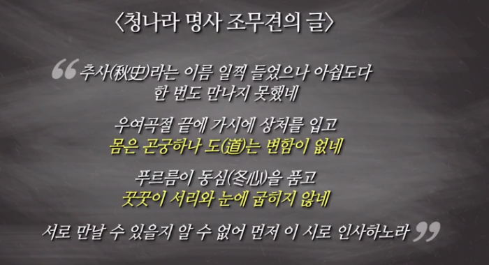 추사 김정희는 돌, 청동기 비단 따위에 남겨진 기록들을 연구하는 금석학의 대가였다. 다른 사람이 비석인 줄 알았던 북한산 진흥왕 순수비, 평양에 있는 고구려 비석도 많이 정체를 밝혀내기도 했다. 또한 그는 문인이자 서예를 하는 예술가이기도 했다.