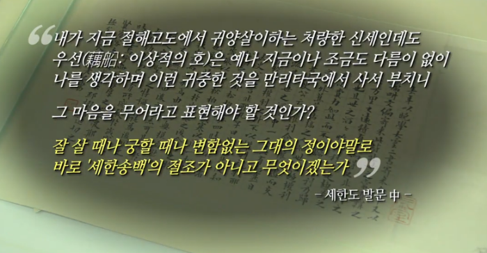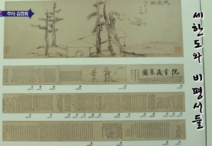 이상적이라는 제자의 지조가 소나무처럼 변치 않는다는 뜻을 그림에 새긴 것이다. 이상적은 자신의 스승이 준 선물을 가지고 중국 문화예술계의 비평왕에 해당하는 몇 사람을 만나서 비평을 받았고 국내의 비평가들에게도 비평을 많은 글이 세한도 뒷편에 쭉 쌓여서 전시되고 있다. 청나라 명사 16인과 국내 명사 3인의 평론이 이어져 있다.