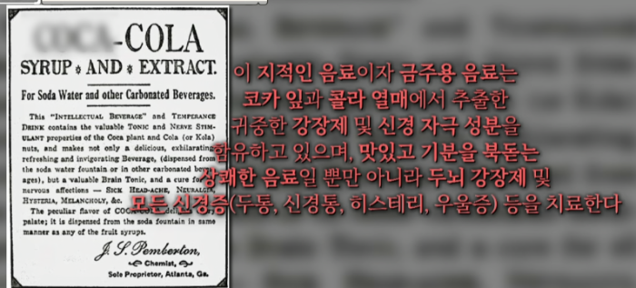 미국 애틀렌타의 한 약제사 존 펨버튼은 남북전쟁 당시 남부 구인으로 참전했다가 부상을 당하고 모르핀에 중독되어 있었다. 이를 대체할 수 있던 약을 찾던 중 코카 잎에서 추출한 코카인을 알게 된다. 이 코카인과 콜라 나무에서 추출한 콜라 열매의 추출물로 콜라의 원조인 매약을 만들게 된다.