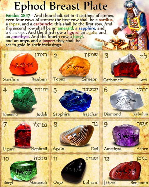 루비 (르우벤) 황옥 (시므온) 에메랄드 (레위) 터키석 (유다) 사파이어 (이스라엘) 다이아몬드 (스불론) 히아신스 (단) 마노 (납달리) 자수정 (갓) 녹주석 (아셀) 호마노 (요셉) 벽옥 (베냐민)