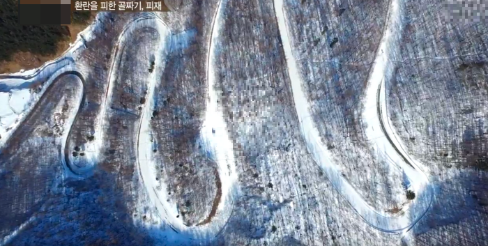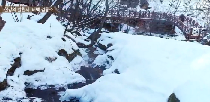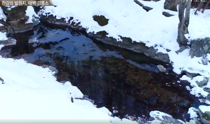 겨울 금대봉 눈길을 20여 분 올라오면 물소리가 들린다. 물소리를 따라 올라가면 마치 이무기가 꿈틀대는 듯한 물길이 나타난다.