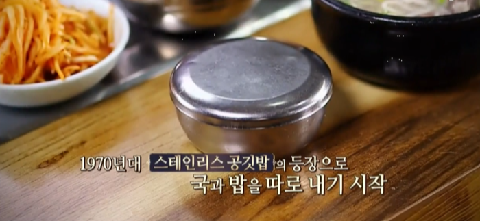 옛날는 모두 밥에 국을 말아서 한그릇에 줬는데 밥과 국이 따로 나오는 결정적 계기는 1970년 중반쯤에 스테인리스 공깃밥의 등장때문이다. 스테인리스로 만들어진 뚜껑이 있는 공기밥으로 인해 따뜻하게 보관이 가능해지면서 따로 국밥이 외식업계에 퍼진 것이다.