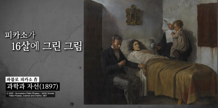 초기에 피카소의 그림은 인물묘사가 사진을 그려놓은 듯 세밀하다. 그림 속 남자는 피카소의 아버지이고 그림의 주제도 철하게 아버지가 지도한 것이다. 그래서 1897년 <과학과 자선> 작품으로 마드리드에서 열린 미술전에서 입선을 했다. 말라가 지역 미술전에서는 금메달을 땃다.