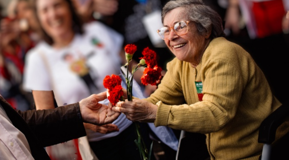 포르투갈의 젊은 군인들이 독재 정권에 반기를 들며 거리로 나섰고, 사람들은 그들이 정말로 정권을 바꿀 수 있을지 긴장 속에서 지켜보고 있었다. 그날, 한 여인이 평범하지만 역사적인 순간을 만들어낸다. 그녀의 이름은 **셀레스트 카에이루(Celeste Caeiro)**로 그녀는 자신이 일하던 식당의 개업 기념일을 축하하기 위해 빨간색과 하얀색 카네이션을 가지고 있었는데 거리에서 군인들을 본 그녀는 즉흥적으로 그들에게 꽃을 나눠주었고 평화의 상징으로 군인들은 이 꽃을 총구에 꽂았고 이 모습을 본 시민들이 합류하면서 거리 전체가 카네이션으로 가득 찼다. 그래서 이 혁명이 카네이션 혁명이라는 이름을 얻게 되었다.