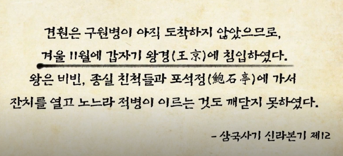 포석정에 대한 이야기로 후삼국 시대 신라 경애왕은 적이 들어오는 쳐들어오는 줄도 모르고 포석정에서 흥청망청 술을 마시고 잔치를 벌이고 있었다는 이야기가 신라가 망한 결정적 장면으로 많이 회자가 되고 있다. 후삼국시대 중심은 서라벌 경주였다. 후백제 견원은 신라의 중심부를 노리고 있었는데 마침내 11월에 견원은 신라의 왕경에 침입하였다.