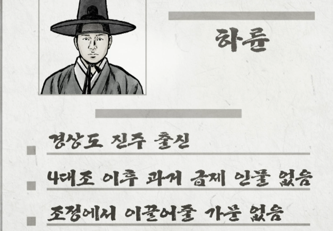 하륜과 정도전은 그들이 모시던 일인자 이방원 이성계와 똑같은 운명을 걷게 된다. 1365년 고려 공민왕 시기에 개경에서 과거시험이 열리던 날이었다. 하륜의 고향은 진주였다 진주에서 과거 시험을 보기 위해 서울로 올라왔었던 하륜의 집안은 사실 출세하는 거리가 먼 집안이었다.