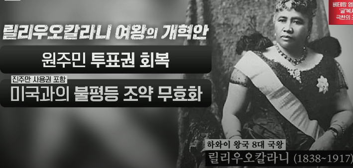 1891년 왕위에 오른 **여왕 릴리우오칼라니(Queen Liliuokalani)**는 하와이 왕국의 자주권 회복을 위해 노력했다. 특히 투표권 회복과 펄 하버를 미국에 넘겨준 조약 폐지를 추진했다.
