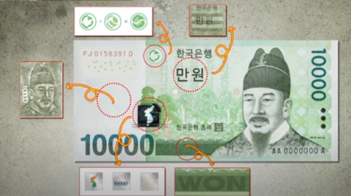 • 위조 방지 기술: 10,000원권은 최첨단 위조 방지 기술이 적용되어 있다. 지폐를 기울이거나 빛에 비춰보면 숨겨진 다양한 상징물들을 발견할 수 있는데, 홀로그램 안에 태극 문양의 건곤감리(乾坤坎離)가 보이는 것이 그 예이다.