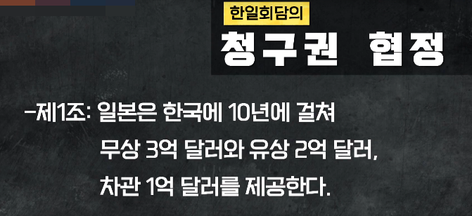 - 한국 정부가 개인 배상금을 받아 대신 사용하는 방식 → 강제징용 피해자 등의 배상 문제가 해결되지 않음