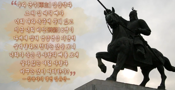 김춘추가 나당연합을 위해 648년 당으로 떠난 시점, 김유신은 옥문관 전투에서 백제군에게 큰 승리를 거둔다. 그리고 백제 장수 8명을 생포하고 대야성 전투에서 김추추의 사위 김품석과 딸 고타소의 유해를 맞교환한다.