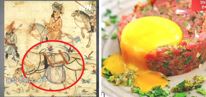 13세기  칭기스칸이 몽골제국의 기마병을 이끌고 유라시아 대륙을 정벌했던 때, 이들은 말을 타고 다니기 때문에 쌀이나 밀을 싣고 다니기 무거워서 고기를 말과 안장 사이에 넣고 다져서 먹었던 음식이 기원이라는 설이 있다. 유럽에서 몽골족을 타타르족이라고 불러 타타르 스테이크로 명명했는데 이것이 14세기 무렵 러시아를 거쳐 독일 함부르크에 전파되었다.