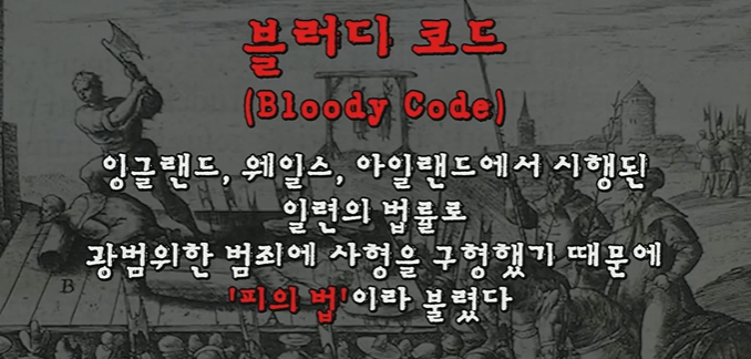 그런데 여기서 범죄자가 늘어나게 되는 결정적인 요인이 하나 더 있었습니다. 바로 당시 영국의 지나치게 까다로운 법 때문이었다. 오만원 어치의 물건을 훔친 사람을 즉시 사형에 처했다. 땔감으로 쓰려고 나무를 맘대로 베면 역시 사형이었다. 당시 형벌은 교화보다는 엄벌로 다른 범죄를 막으려는 목적이 더 커서 법이 상당히 가혹했다. 17세기에는 사형이 가능한 범죄는 50개 정도였으나 18세기 말에는 이것이 220개로 늘어나게 된다. 그래서 이렇게 가혹한 법은 블러디 코드, 피의 법이라는 악명이 붙게 되었다.