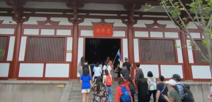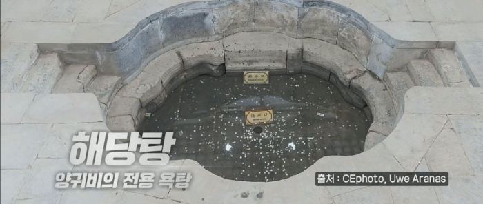 모양이 해당화의 꽃잎 모양을 닮아서 해당탕이라고 이름 지었다. 이곳은 녹보석으로 치장되어 있었고 양귀비는 여산의 경치를 바라보며 온천에서 매일 목욕을 즐겼다고 한다. 설에 따르면 하루에 10번의 목욕을 할때도 있었다고 한다. 그 이유는 양귀비는 양귀비의 겨드랑이에서 심한 냄새가 많이나서 냄새를 없애려고 목욕을 많이했다는 설이 있다. 그러나 현종은 잘 느끼지 못했다고 한다.