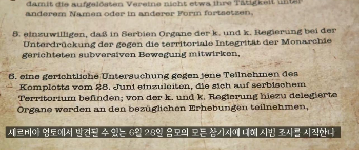 사라예보 사건으로 전쟁 분위기는 고조되었고 1914년 7월 23일 오스트리아가 세르비아에 최후통첩을 한다. 가장 중요한 최후통첩 6번 조항이었다. 독일어로 작성된 최후통첩문은 오스트리아의 공식언어가 독일어였다. 선전포고 5일전 7월 23일 오후 6시 최후통첩을 전달했다. 48시간 이내 답변할 것을 요구했다.