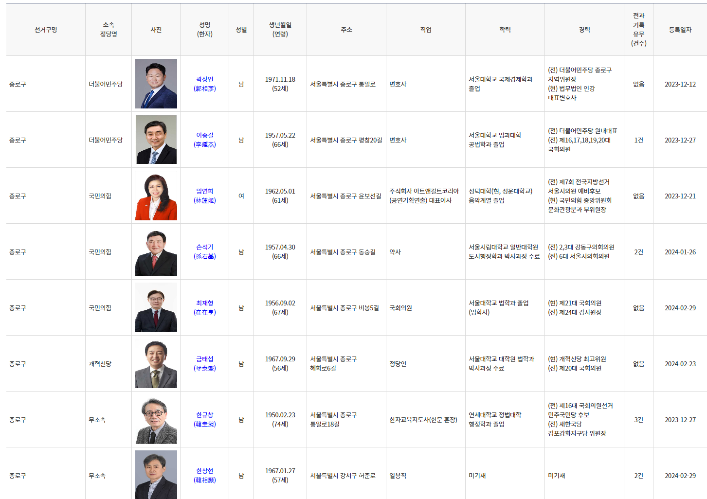 선거구명소속정당명사진성명(한자)성별생년월일(연령)주소직업학력경력전과기록유무(건수)등록일자
