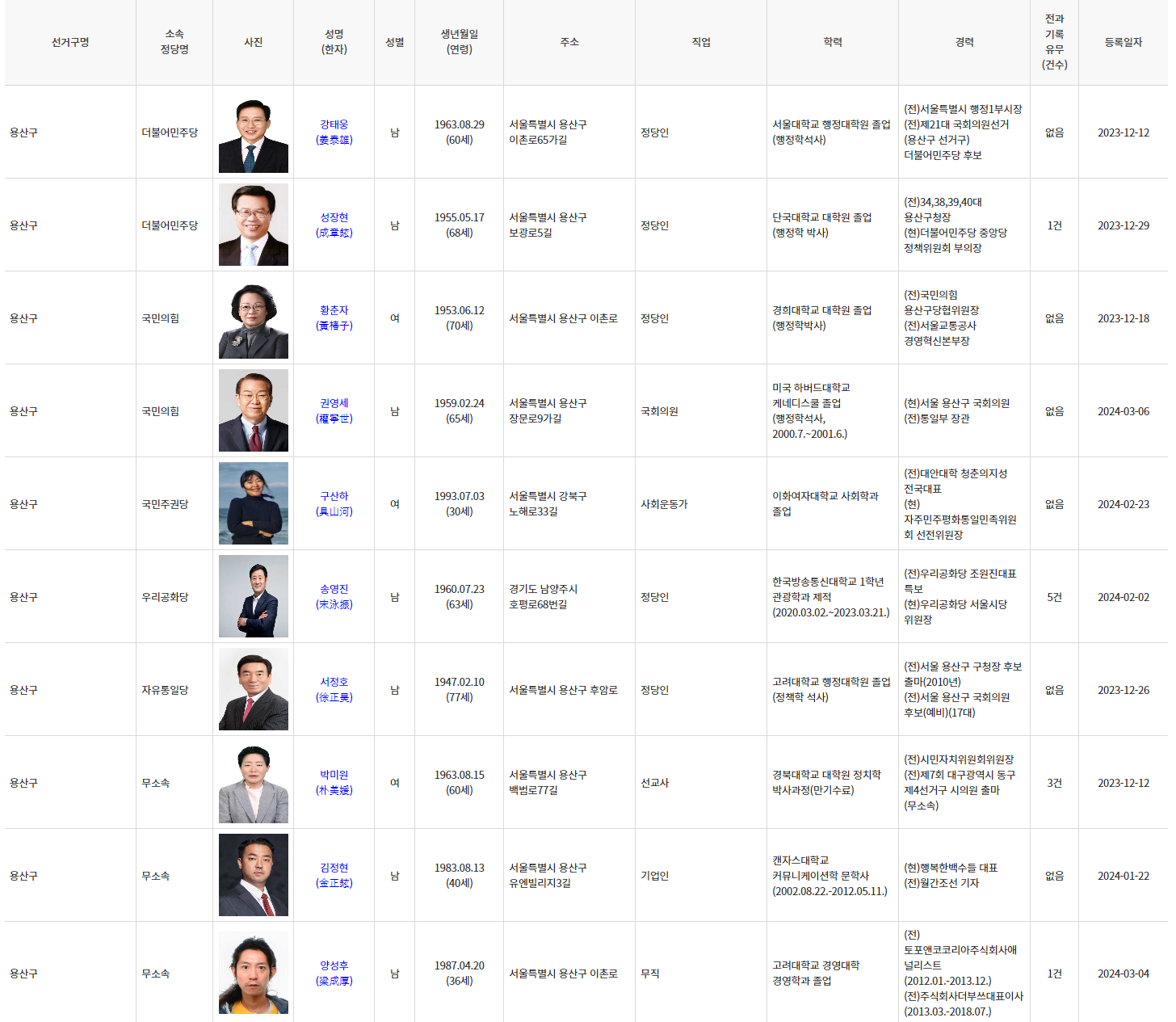 선거구명소속정당명사진성명(한자)성별생년월일(연령)주소직업학력경력전과기록유무(건수)등록일자