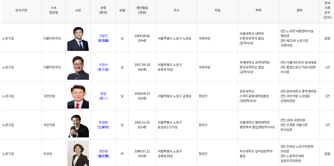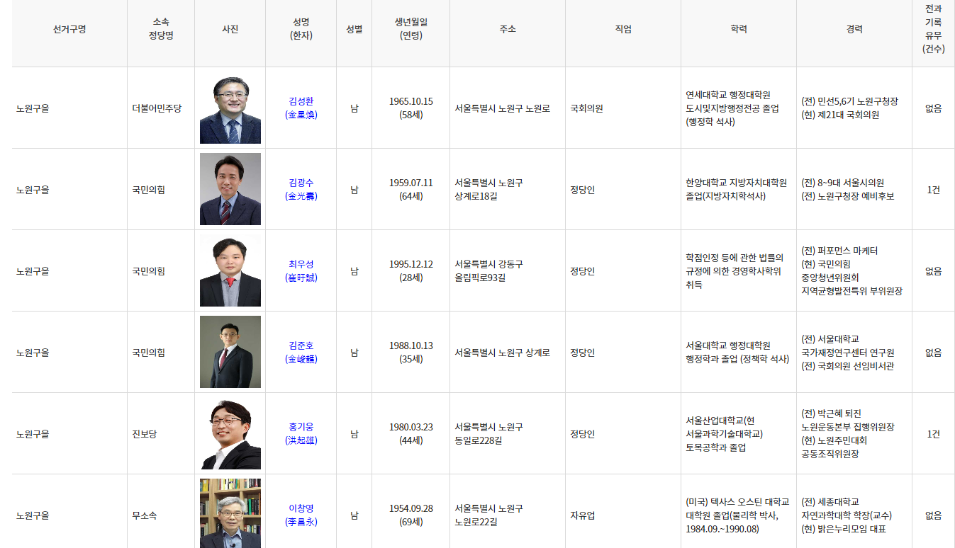 선거구명소속정당명사진성명(한자)성별생년월일(연령)주소직업학력경력전과기록유무(건수)등록일자