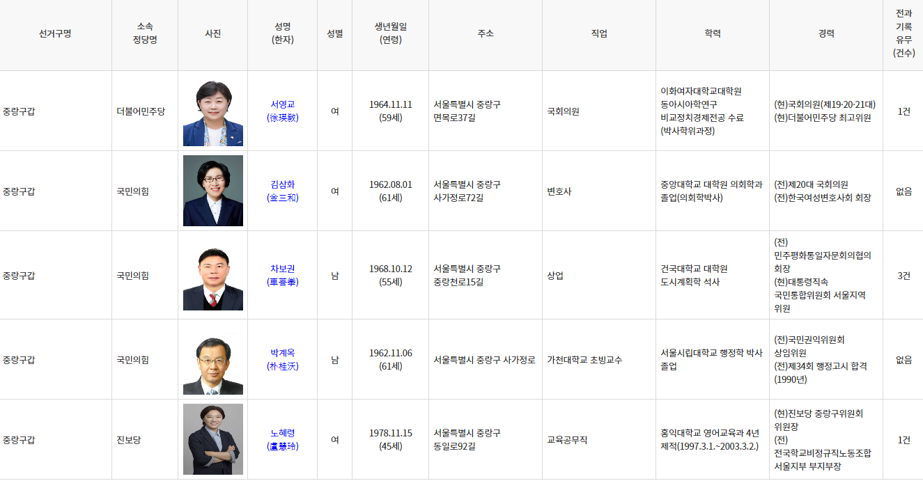 선거구명소속정당명사진성명(한자)성별생년월일(연령)주소직업학력경력전과기록유무(건수)등록일자