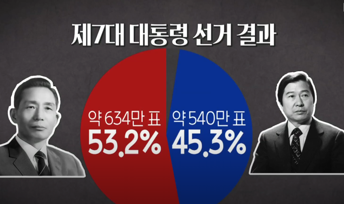 이후 김대중과 박정희의 경선이 시작되면서 김대중에게 의문의 사고가 많이 일어났다. 김대중 자택에 폭발물 사고도 일어났고 야당 선거대책본부장의 집에 화재 발생, 유세 다니던 중 김대중의 교통사고를 겪었다. 이 사고로 목숨은 건졌으나 한쪽 다리를 절게 되는 사건이었다. 이때부터 YS와 DJ는 정치계의 거목으로 각인되었다.  그리고 제 7대 대통령 선거결과는 박정희의 승리였다.