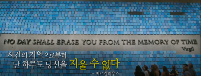구멍을 뚫으면 사람이 떨어지지 않게 난간이란 것을 만들어야 하는데 풀 전체 난간에 희생자의 이름을 새겨 놓고 물을 구경하려면 난간으로 가야하고 자연스레 만지게 되는 희생자의 이름들이다. 메모리얼을 보면서 사건에 대한 기억을 공유하고 가는 것이다.