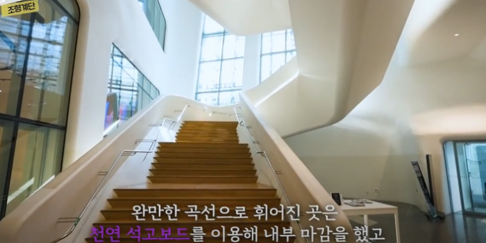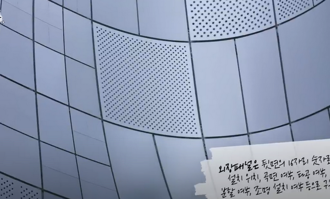또한 DDP 내부, 외부에는 기둥이 없다. 사람의 양팔 넓이보다 큰 메카칼럼이 4개가 들어가 있고 그 위에 메가트러스가 공간을 매달고 있다. 외장패널을 설치하기 위해 스페이스 프레임을 통해서 내부 무주 대공간, 외부 켄틸레버 구조를 시공했다. 창문, 기둥이 없다. 이유는 외부에서 봤을때 비정형의 곡선이 이어지는 느낌을 보여주려고 했기 때문에 창문을 넣으면 디자인의 흐름이 깨지기 때문에 만들지 않았다. 구멍뚫린 패널을 통해 창문의 역할을 하고 있다.