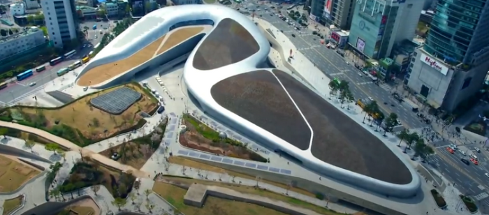 DDP 동대문 디자인 플라자는 모두 곡선으로만 이루어진 건물로 미래지향적 곡선의 미학을 즐길수 있는 건물이다. 45133장의 모든 외벽 패널이 각각의 다른모양으로 시공되었고 최신기술들이 동원되었다. 외벽 패널은 디자인 요소, 빗물의 배수, 채광, 조명의 기능이 있다. 조명은 외장 패널의 구멍을 통해 내부의 led 조명이 하얀색 방수층을 통해 반사되면서 디자인적 요소를 표현할수 있는 조명이 완성된다.