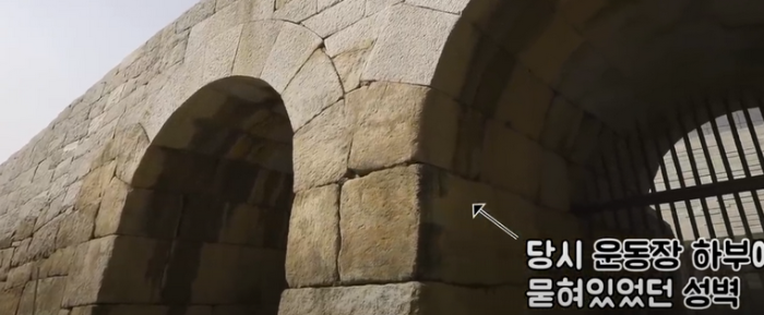 이 자리에 이간수문이 있었다. 도성의 성곽을 통과하는 수문으로 물길이 이 문을 통해 청계천 본류와 합류한 지점이고 동대문에서 남산쪽으로 물줄기가 올라갔다. 1925년 일제가 성곽 위에 동대문 운동장을 지었는데 경사진 곳에 동대문 운동장을 지어야 했기에 성벽을 허물어야 가능했다. 그래서 성벽의 윗부분을 허물고 흙을 덮어 버린 것이다.